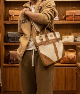 Moreover, the adjustable and detachable shoulder strap allows flexible use as a shoulder or crossbody bag. Because of this, the bag adapts easily to different situations, including travel, office work, and short business trips. The combination of neutral fabric tones with brown leather finishing creates a professional yet handmade appearance, making it suitable for both formal and casual environments.